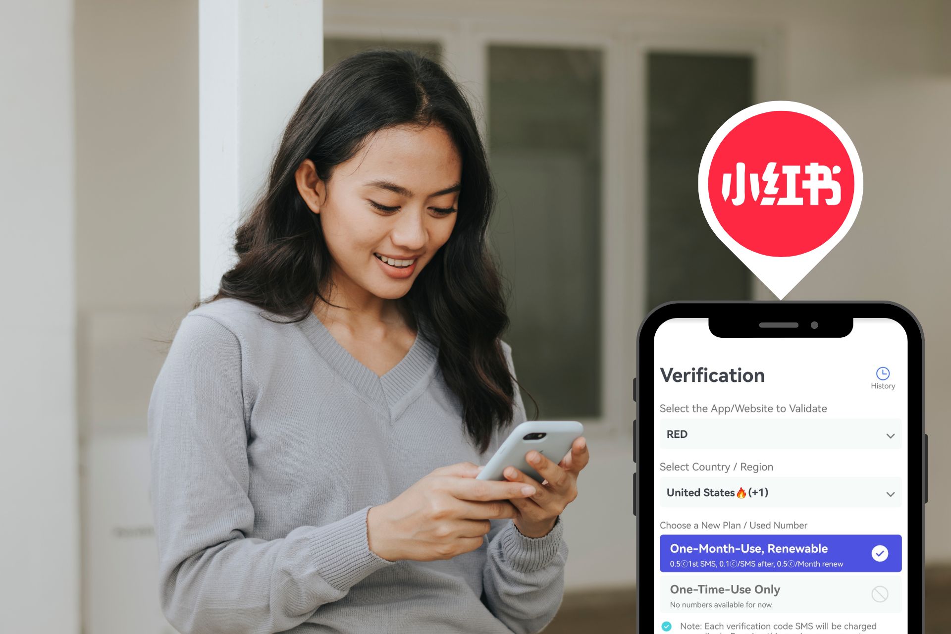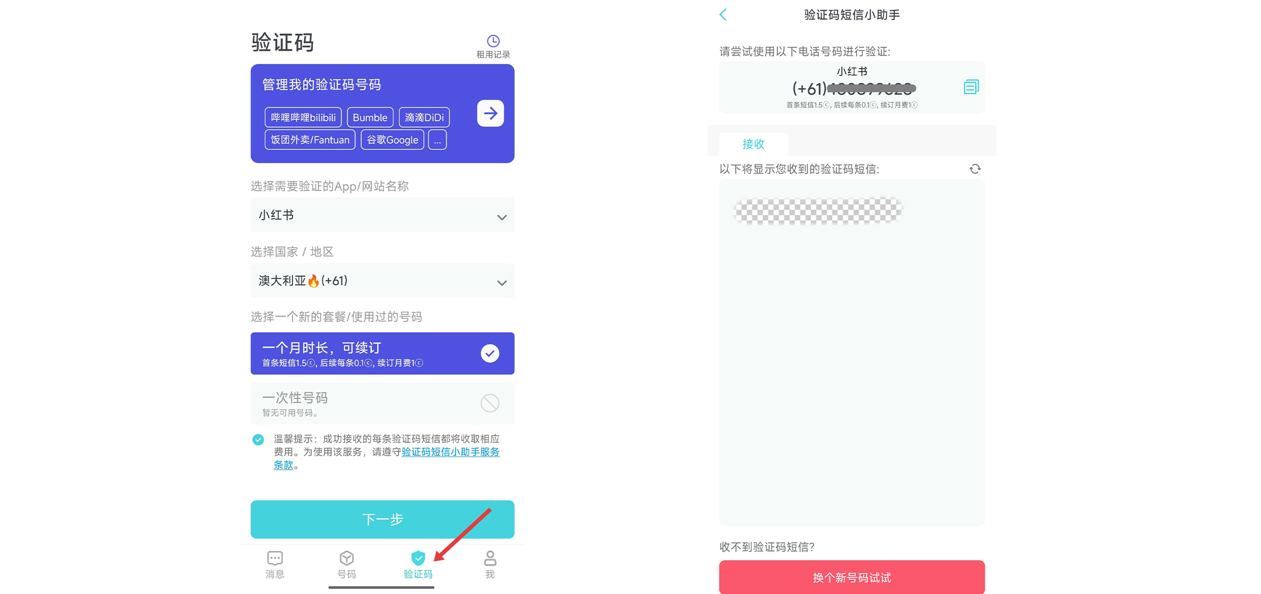 3. 小红书注册:打开小红书App,选择国家区号后再输入 PingMe 提供的号码,获取验证码后并填入。